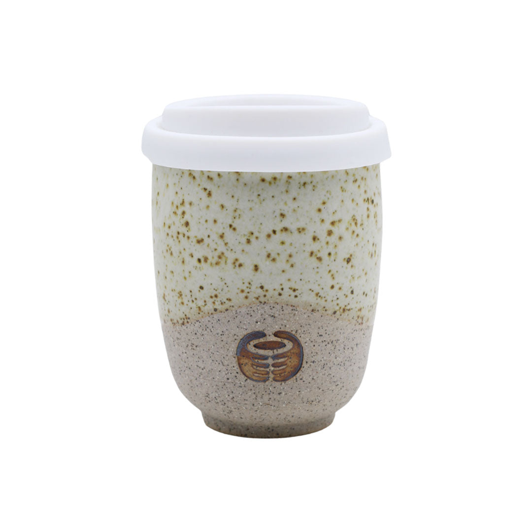 Sandy white matte glaze over raw clay. Some cups will be mostly white and some will feature-rich, brown speckles. All cups are unique, no two are identical. The throwing rings not only leave the makers mark from the hands that made them, they also add texture for extra grip.