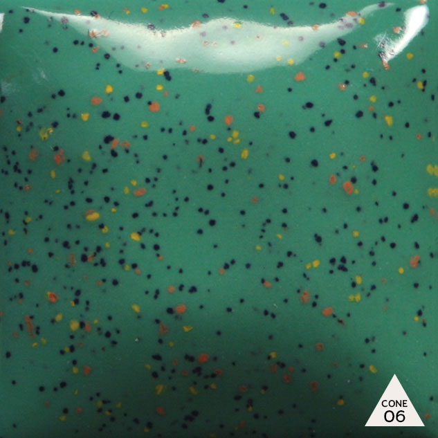 Cone 06 oxidation: Speckled Jaded is a heavily pigmented, viscous Stroke & Coat glaze with yellow, orange and blue specks that can be used for brush strokes or opaque coverage. One coat will create a translucent finish with subsequent coats adding opacity. We suggest two to three coats for full opacity and all over coverage. Will fire to a gloss finish without clear glaze.