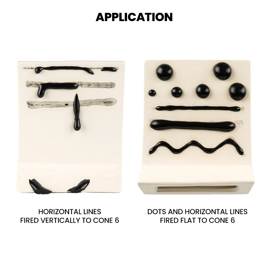 - When applied as a horizontal line, the fired glaze effect may separate or break, turning into vertical drips.