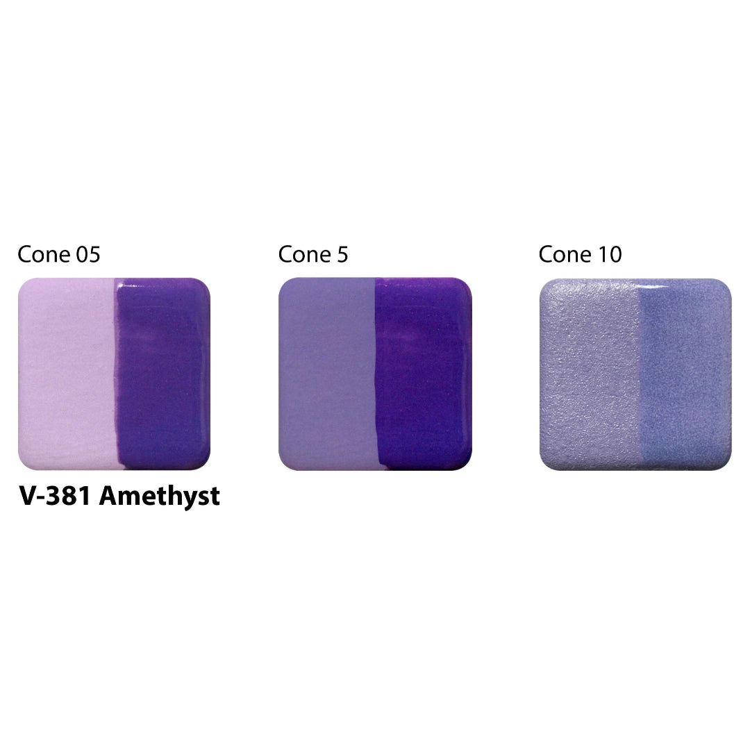 Amethyst is a deep grape colour that is vivid at cone 05, darkens at cone 5, and becomes a deep violet and begins to lose its colour slightly at cone 10. A clear glaze deepens the colour of the underglaze significantly at any temperature.